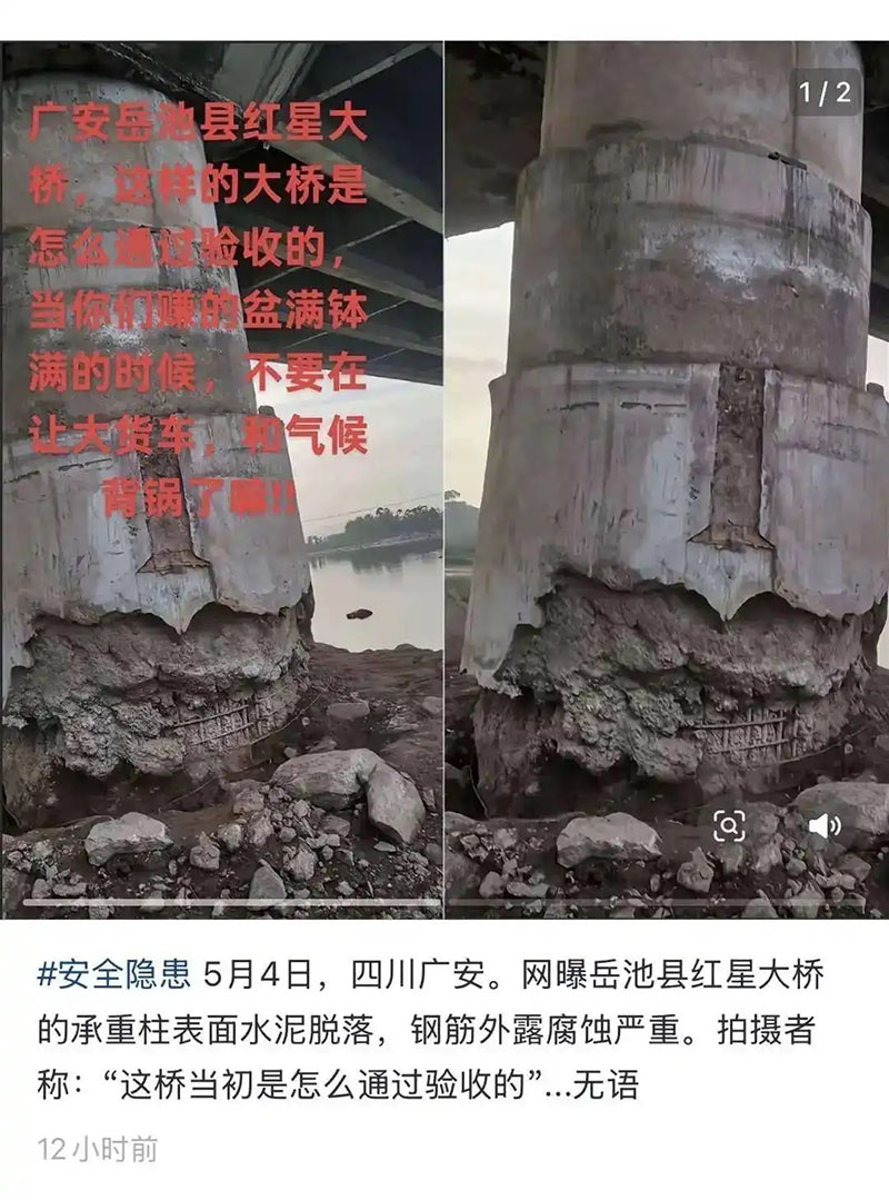 5月4日,有网友通过视频平台反映四川岳池县红星大桥存在承重柱表面水泥脱落、钢筋外露腐蚀等问题,并就桥梁验收情况提出疑问。